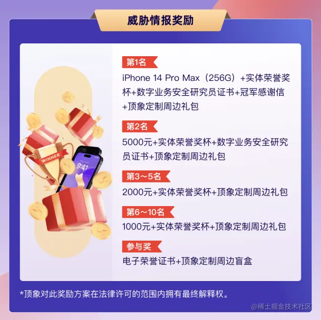 最后,顶象在这里再次感谢各位白帽黑客积极参与到此次业务安全保卫战中来,为业务安全贡献自己的一份力量,后续顶象也会将业务安全保卫战常态化,也诚挚邀请各位白帽黑客们继续支持顶象业务安全保卫战。