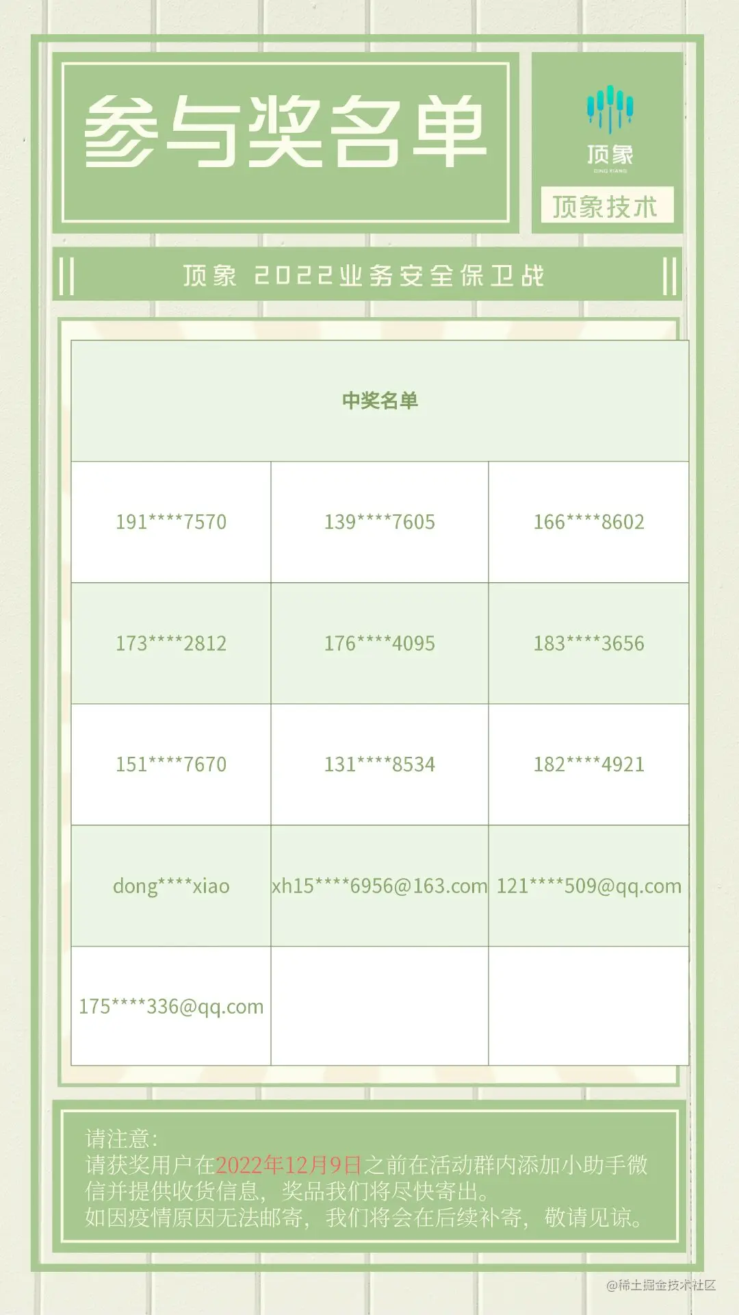 当然,除了恭喜本次获奖的白帽子们外,本次顶象还特别设置了参与奖,获奖名单如下: