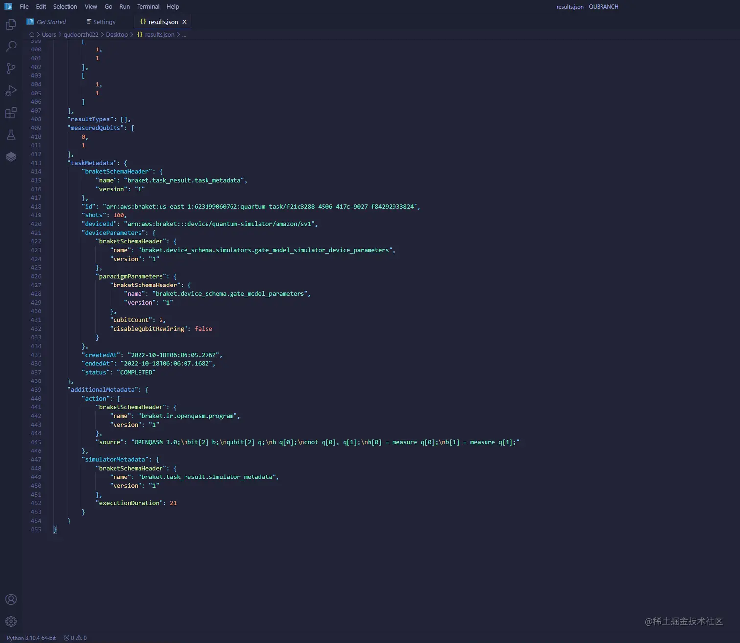 量子线路创建完成后,便可以按需要选择合适的量子模拟器。最后运行量子线路就能得到最终模拟得出的结果。最终任务可以从 Amazon Braket 上下载。具体测量信息和参数信息如下图所示: