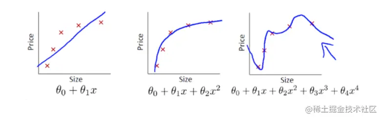 先来看一组图片,这三张图片是线性回归模型,拟合的函数和训练集的关系