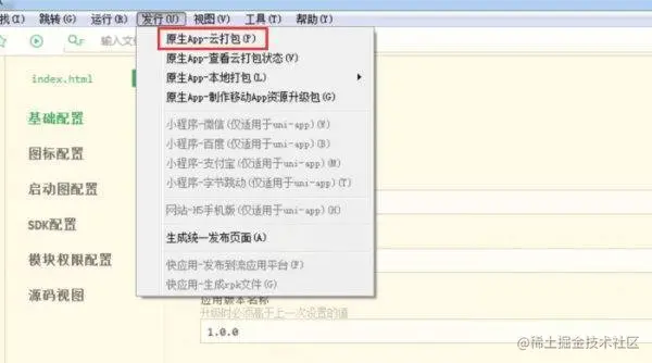 申请到p12及mobileprovision这两个iOS证书文件即可去打包了!四、iOS打包IPA各开发者工具打包教程,根据自己使用的平台去打包,证书都是一样用。这里介绍了几个平台的打包教程,对应自己使用平台的看看,没有写的平台如果不会可以问下技术支持。开心App平台打包网站教程HBuilder打包教程APICloud打包教程phonegap打包教程xcode打包教程APPcan打包教程变色龙打包ipa教程这里以HBuilder平台为例4.1、打开HBuilder工具,选择开发好的项目,点击发行,选择发行为原生安装包。