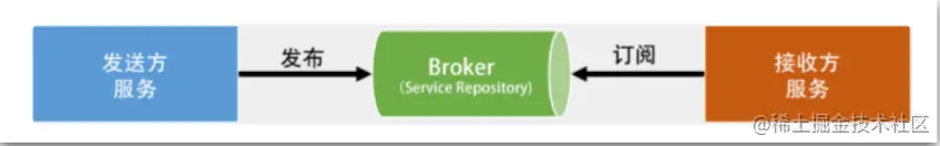 为了解除事件发布者与订阅者之间的耦合,两者并不是直接通信,而是有一个中间人(Broker)。发布者发布事件到Broker,不关心谁来订阅事件。订阅者从Broker订阅事件,不关心谁发来的消息。