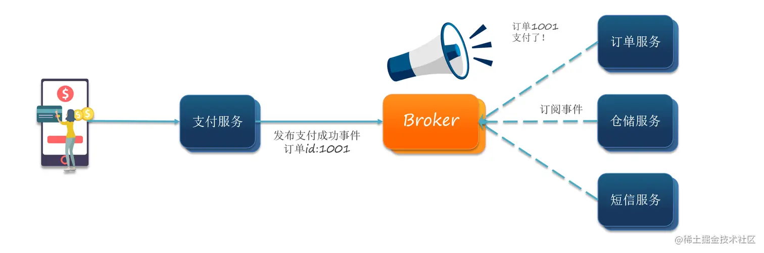 什么是事件代理?代理什么事件?在我们这个业务当中,一旦有人支付成功就是一个事件,那么这个事件将来自然就交给了我们的broker 去管理,那订单服务仓储服务和短信服务就会去找broker 呀,说大哥将来真有人支付了,你得通知我们一下啊,这就叫做事件订阅。