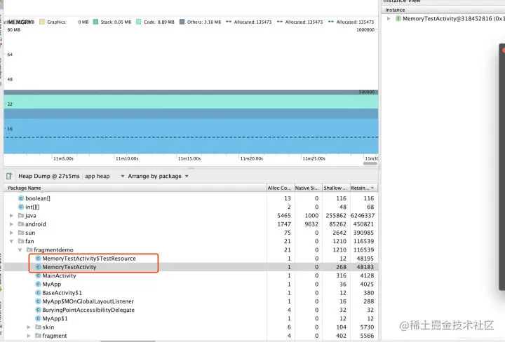 借助Android Profiler可以查看MemoryTestActivity实例有三个(Alloc Count实例数量为3)-不断打开关闭MemoryTestActivity页面,由于关闭MemoryTestActivity不会垃圾回收不会立即执行,为了测试点击强制垃圾回收,我们发现会有一个MemoryTestActivity(@318435616))没有被回收,因为context和textview一直持有MemoryTestActivity(@318435616))实例的引用;