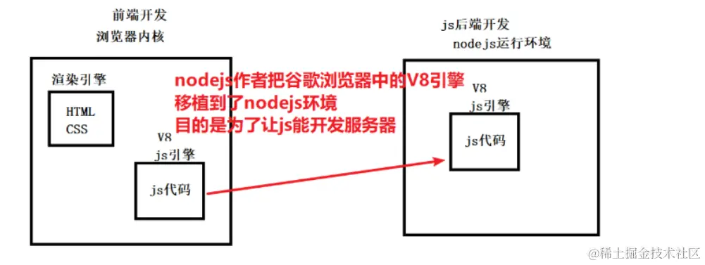 nodejs作者把谷歌浏览器中的V8引擎移植到了nodejs环境,目的是为了让js能开发服务器