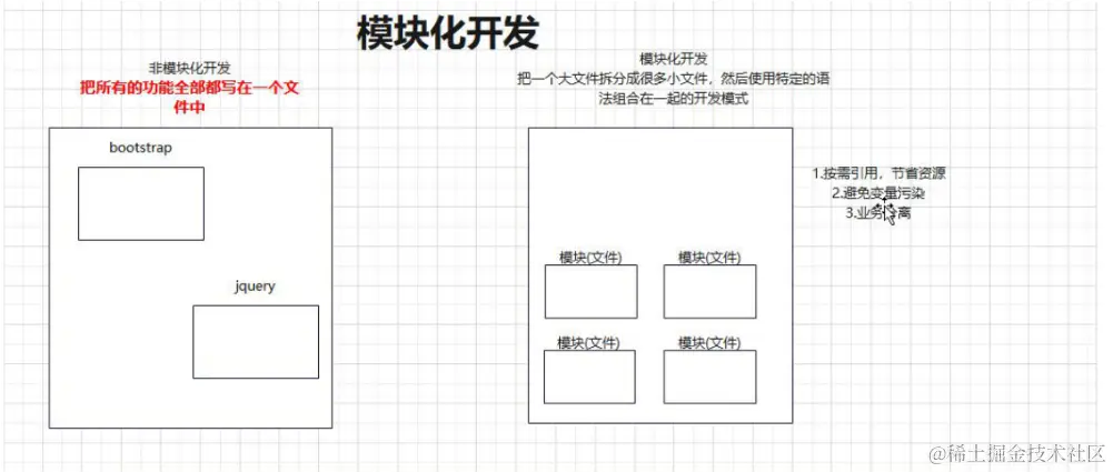 - 模块化就是把一个大的文件拆分成很多个小文件,用特定的语法将各个文件(模块)组合到一起