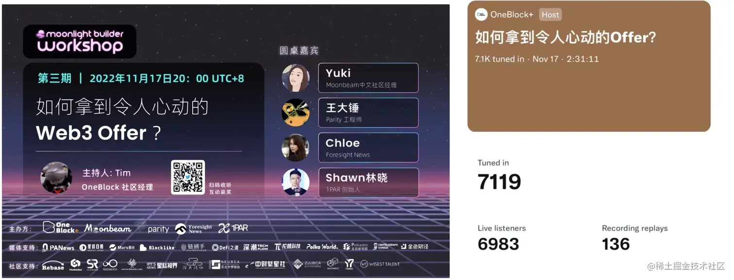 带着这些好奇,Oneblock 和 Moonbeam 在 11 月 17 日联合举办的第 3 期 Moonlight Builder Workshop 邀请到 Web3 行业开发、媒体、运营、投资人等嘉宾,他们现身说法,以**“如何拿到令人心动的 Web3 Offer”**为主题,揭开了神秘又惬意的“数字游民”的面纱。本次活动吸引了近 7000 名小伙伴的参加,上榜 Web3 Space 最热 Top10 周排行,相信大家在嘉宾们诚意满满的分享中收获颇多。下文将回顾本次活动嘉宾们的精彩内容。
