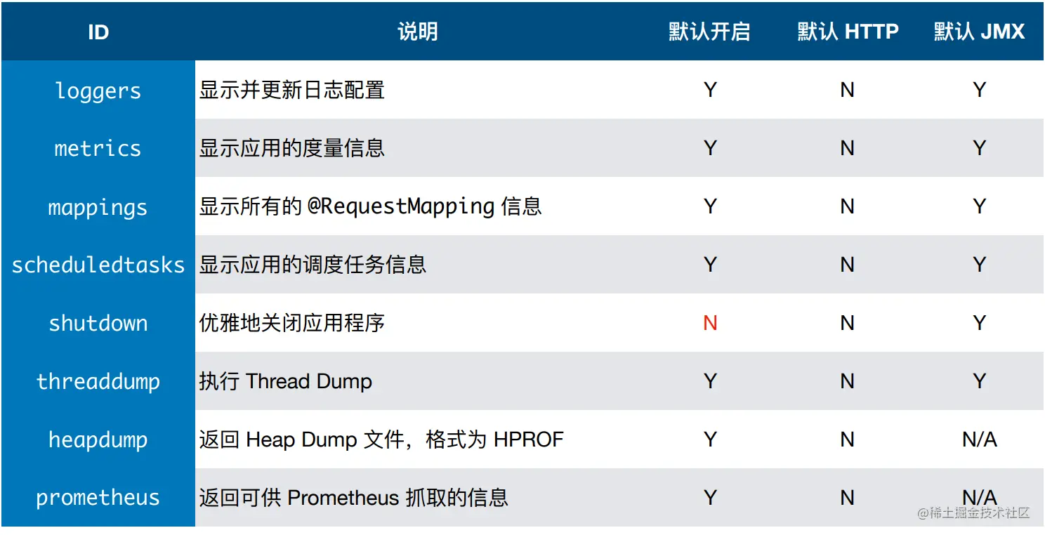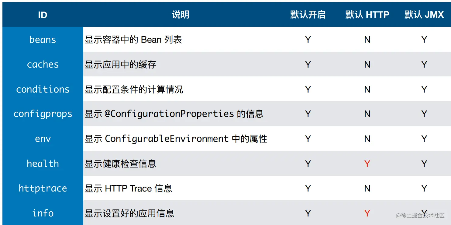 由于endpoints可能包含敏感信息,应仔细考虑何时公开它们。下表显示了内置endpoints的默认公开。