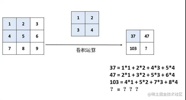 卷积层是一组平行的特征图(feature map),它通过在输入图像上滑动不同的卷积核并运行一定的运算而组成。此外,在每一个滑动的位置上,卷积核与输入图像之间会运行一个元素对应乘积并求和的运算以将感受野内的信息投影到特征图中的一个元素。这一滑动的过程可称为步幅 ,步幅是控制输出特征图尺寸的一个因素。卷积核的尺寸要比输入图像小得多,且重叠或平行地作用于输入图像中,一张特征图中的所有元素都是通过一个卷积核计算得出的,也即一张特征图共享了相同的权重和偏置项。举个例子,有一张3*3的特征图,与2*2的卷积核进行卷积运算,得到的结果为一张2*2的特征图,运算过程如下图所示: