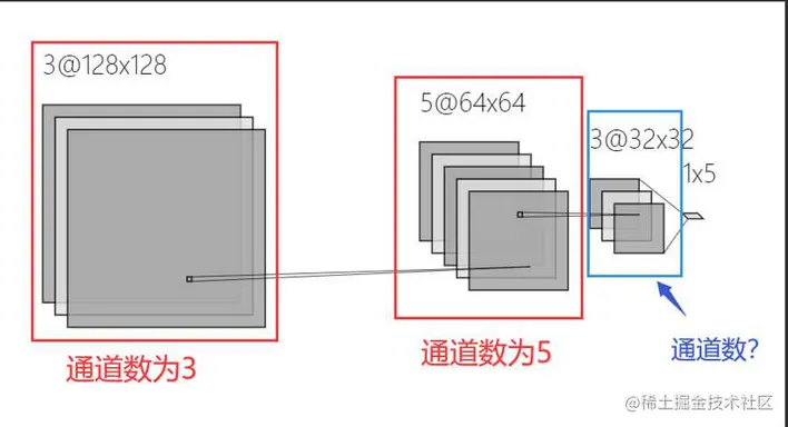第一个红色框内通道数为3,它和我们常见的彩色图片通道数相同。第二个框的通道数为5,第三个蓝色框内特征图的通道数是多少呢?