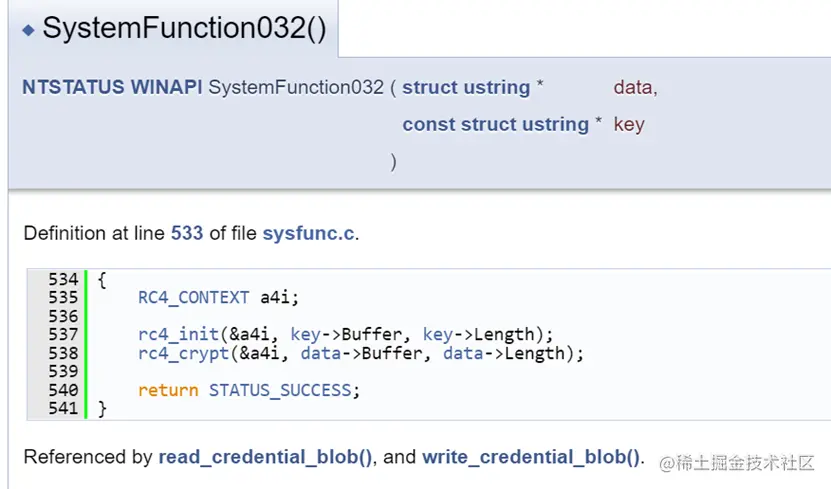 这个函数能够通过RC4加密方式对内存区域进行加密/解密。例如,ReactOS项目的代码中显示,它需要一个指向RC4_Context结构的指针作为输入,以及一个指向加密密钥的指针。
