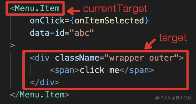 所以应该是将事件绑定到Menu.Item上,接下来又有个问题:在获取data-*等对象时是通过target还是currentTarget去获取呢?因为在DOM上点击事件默认就是冒泡的,也就是说点击Menu.Item内的子元素都会触发父元素的点击事件。如果通过点击内层元素span触发事件,这时候就有了两个对象: