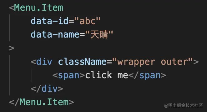 比如上图中的组件,如果需要在点击Menu.Item的时候能够获取到data-id, data-name的内容,应该将点击事件绑定到外层的Menu.Item上,还是内层的span元素上呢?分析发现,其实绑定到内层的span上会有个问题:只有在精确选中span时时间才会触发,点击span外的元素会无法触发事件,这其实很不友好。