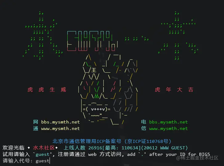 基于 CSI 控制指令可以实现的功能是非常丰富的。如果你使用过支持 telnet 的 BBS 论坛的话,应该会有所了解。例如,你可以在终端中执行如下命令,以 telnet 的方式访问水木社区体验一下其魅力: