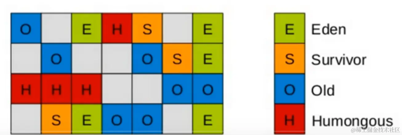 G1 将堆划分为一组大小相同的堆区域(region),每个区域都是连续的虚拟内存范围。每个区域都可能是 Eden 区域、Survivor 区域或, Old 区域, humongous区域或是空白区域(empty)。