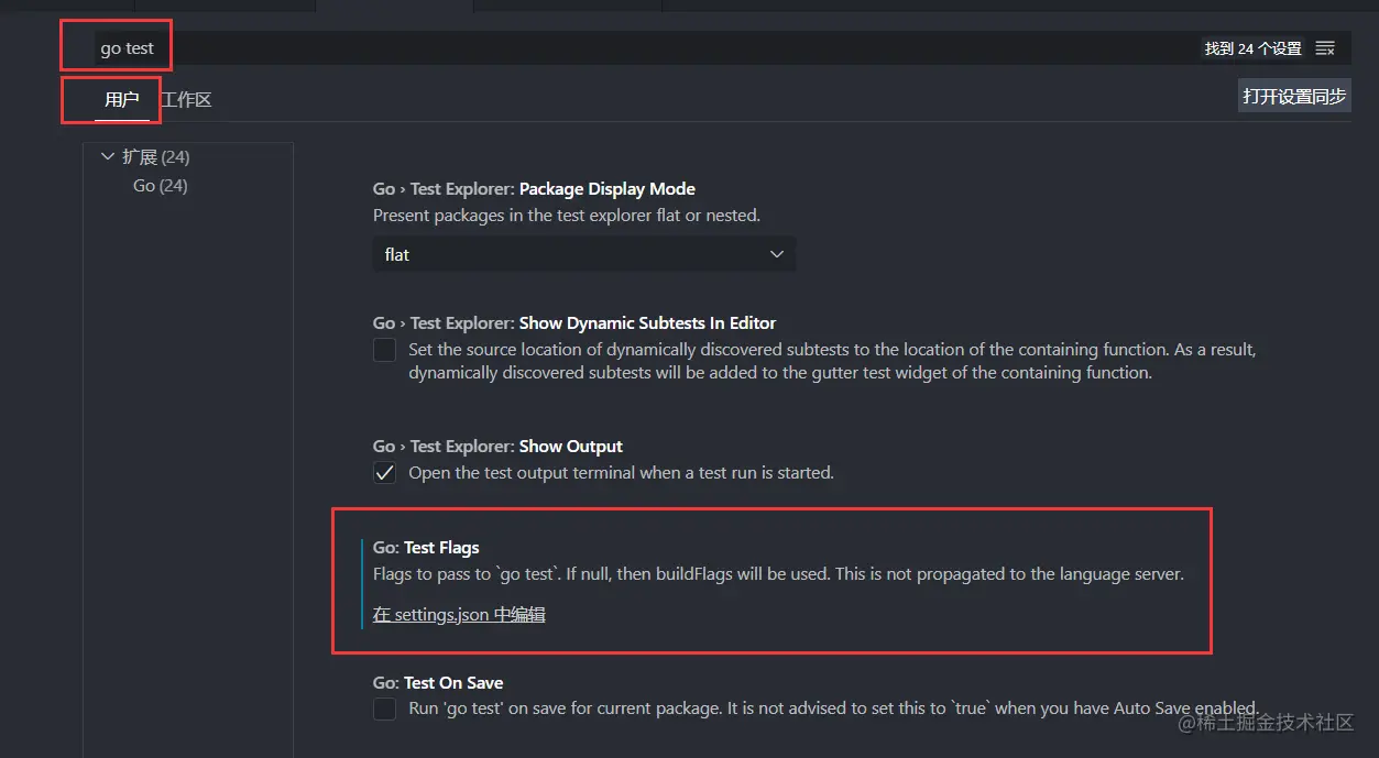 vscode 的 go 插件在 执行测试用例的时候 是调用 go test 来执行的, 但是他没有加上 -v 参数, 因此我们通过 vscode 配置上该参数就可以了
