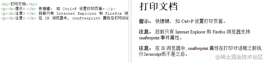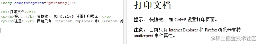 窗口事件属性: 由窗口触发该事件 (适用于body标签) 1.onafterprint属性:在打印文档之前运行脚本,在用户设置页面打印及打印对话框出 现后触发。 表现形式:2.onbeforeprint:在文档打印之前运行脚本,在用户设置页面打印,但在打印对话框出 现前触发。 表现形式: