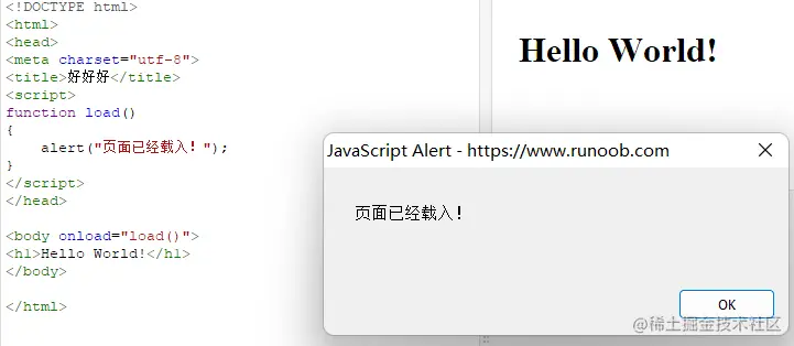 注:onafterprint属性通常与onbeforprint属性一起使用。 3.onbeforeonload属性:在文档加载之前运行脚本 4.onblur属性:在窗口失去焦点时运行脚本 5.onfocus属性:当窗口获得焦点时运行脚本 6.onload属性:当文档加载时运行脚本,在文档对象加载完成后触发,通常用于body标 签元素中,用于在页面完全加载之后执行指定的脚本(包括图片,脚本,css文件)。 表现形式:
