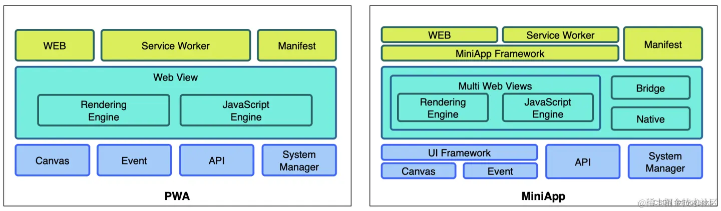 **2、小程序和PWA的架构:**MiniApps 的目的不是要取代渐进式 Web 应用程序 (PWA)、本机应用程序或 Web。而是各有千秋,至于适用的场景,开发者在理解差异之后可以根据场景的不同来进行技术选型。