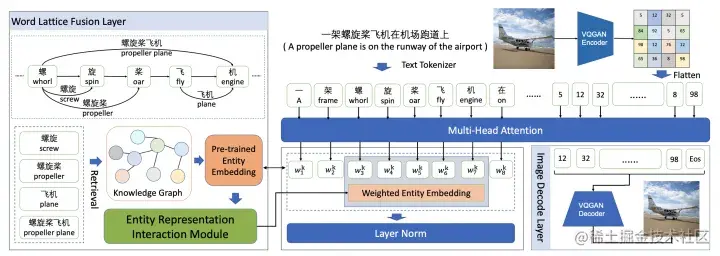 ARTIST模型的构建基于Transformer模型 ,将文图生成任务分为两个阶段进行,第一阶段是通过VQGAN模型对图像进行矢量量化,即对于输入的图像,通过编码器将图像编码为定长的离散序列,解码阶段是以离散序列作为输入,输出重构图。第二阶段是将文本序列和编码后的图像序列作为输入,利用GPT模型学习以文本序列为条件的图像序列生成。为了增强模型先验,我们设计了一个Word Lattice Fusion Layer,将知识图谱中的的实体知识引入模型,辅助图像中对应实体的生成,从而使得生成的图像的实体信息更加精准。下图是ARTIST模型的系统框图,以下从文图生成总体流程和知识注入两方面介绍本方案。