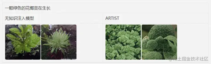 第二个示例为“一颗绿色的花椰菜在生长”。由于模型在训练时对“花椰菜”物体样式掌握不够,当不包含知识注入模块时,模型根据“绿色”和“菜”的提示生成了有大片绿叶的单株植物。在ARTIST模型中,生成的物体更接近于形如花椰菜的椭圆形的植物。