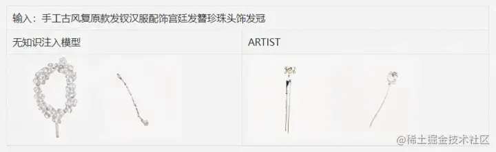 上图可以看出ARTIST生成图像质量的优越性。我们进一步比较我们先前公开的模型(看这里)和具有丰富知识的ARTIST模型的效果。在第一个示例“手工古风复原款发钗汉服配饰宫廷发簪珍珠头饰发冠”中,原始生成的结果主要突出了珍珠发冠这个物体。在ARTIST模型中,“古风”等词的知识注入过程使得模型生成结果会更偏向于古代中国的珍珠发簪。