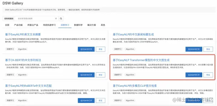 PAI-DSW(Data Science Workshop)是阿里云机器学习平台PAI开发的云上IDE,面向不同水平的开发者,提供了交互式的编程环境(文档)。在DSW Gallery中,提供了各种Notebook示例,方便用户轻松上手DSW,搭建各种机器学习应用。我们也在DSW Gallery中上架了使用Transformer模型进行中文文图生成的Sample Notebook(见下图),欢迎大家体验!