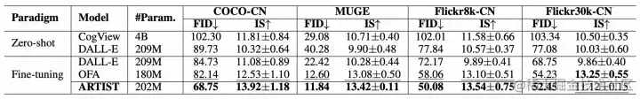 在Baseline方面,我们考虑两种情况:zero-shot learning和标准fine-tuning。我们将40亿参数的中文CogView模型作为zero-shot learner,我们也考虑两个模型规模和ARTIST模型规模相当的模型,分别为开源的DALL-E模型和OFA模型。实验数据如下所示:
