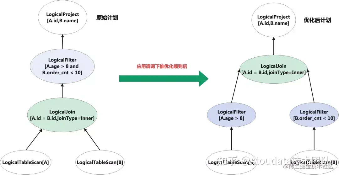 上图左边是原始 SQL 计划,可以看到,通过 Filter 谓词下推规则优化后,Filter 节点已经下推到了 Join 节点之下,这样能够提前对 Scan 节点的数据进行过滤,最终减少进入到 Join 算子的数据量,减少 Join 节点的计算成本。