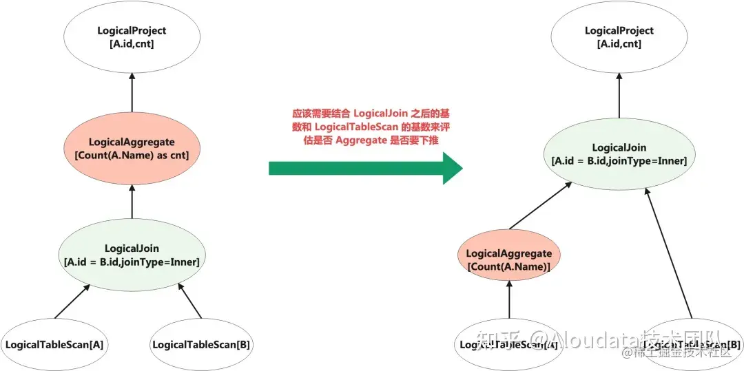 在上图中,LogicalJoin 之后的基数(输出的行数)如果比 LogicalTableScan[A] 后的基数要小的话,Aggregate 不下推其实会比下推更加节约资源。但完全进入 CBO 阶段,如果计划搜索空间过大的话,CBO 找出最优计划的耗时可能又很久。所以在使用 RBO 优化规则时,某些规则可以比较计划转换前后的 Cost 来决定是否应用该规则。目前 Oracle 和 MemSQL(SingStoreDB)的优化器都已经按照这种方式进行实现。