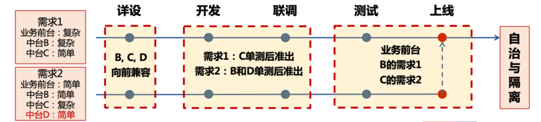 最终期望能够让每个中台服务达到『自治与隔离』,从而解耦各需求点的上线,如下图: