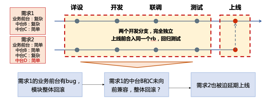 从上述例子中可以看到,微服务架构后,一个业务需求会涉及多个模块,复杂度不尽相同,如果中台服务的每个升级无法做到向前兼容,那么势必会导致需求间的耦合,一旦并行开发的分支增多,因模块间的耦合导致的整体回滚概率将会指数级增长。仍旧是上述这个例子,如果需求1中的中台B有BUG,需要回滚,那么是否导致需求2中的所有模块都要回滚,包括中台D,即使它的改动点非常小。