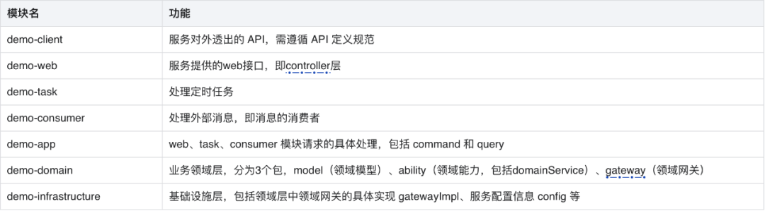 各模块间的依赖关系,demo-web、demo-task、demo-consumer 做为顶层模块,非常薄,这一层的主要作用是独立发布及部署,实现应用级别的隔离。顶层模块调用 demo-app,app模块作为服务的实现,存放了各个业务的实现类,主要分command和query(CQRS 理念)。demo-app 可以调用 demo-domain,也可以调用基础设施层 demo-infrastructure,domain做为领域层主要分3块,model 领域实体,可以是充血模型(DDD的概念);ability 领域能力,是领域对外暴露的服务能力;gateway 领域网关,主要是接口定义,这里的接口可以粗略的理解成一种SPI,也就是交给infrastructure层去实现的接口。