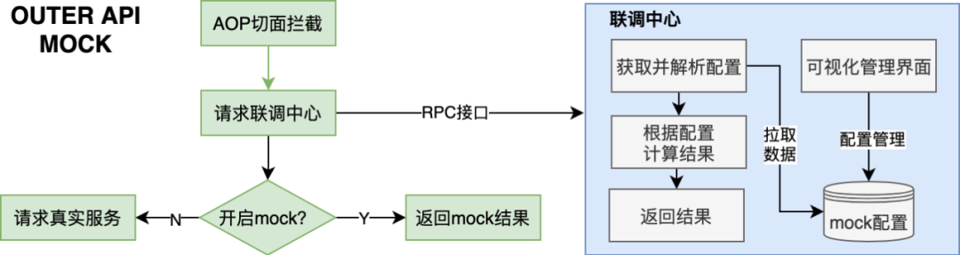 提供服务 mock 能力,在合适的场景下可以解耦对其他服务的依赖。落地联调中心,实现服务级别的动态 mock 能力,并通过 starter 方式让业务模块低成本接入。整体设计分为两部分,client端和server端,如下图: