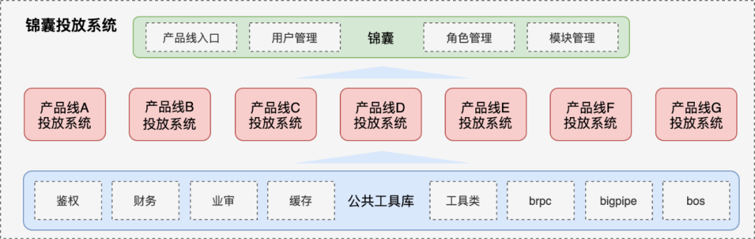 2019年前的单体架构(简称『1.0架构』)图如下所示,整体上分三层,1)统一入口层,提供用户权限管理功能;2)各类广告投放平台独立建设,服务独立部署;3)抽象并沉淀基础工具库,避免各投放平台的重复开发。