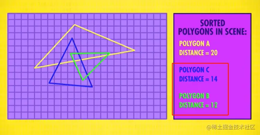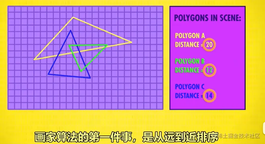 - 第一步,就是从远到近进行排序(A黄色,B蓝色,C绿色 三个三角形的距离)