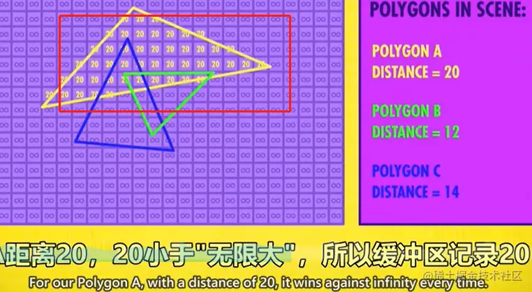 - 首先,每个像素的距离被初始化为“无限大”,然后Z-buffering从列表里第一个多边形开始处理,也就是A