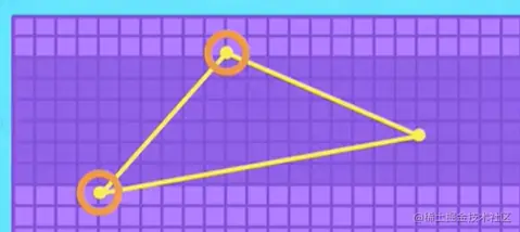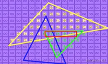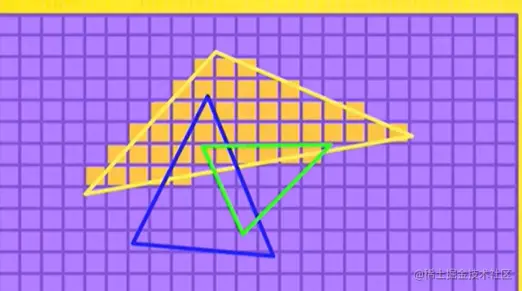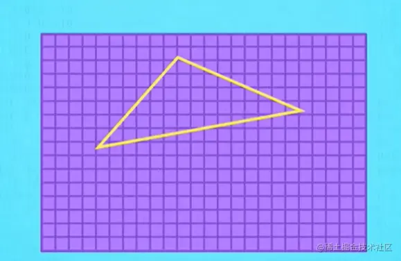 - 然后算法从上往下,一次处理一行,计算每一行和多边形相交的两个点。扫描线算法会填满两个相交点之间的像素 因为是三角形,如果相交一条边,必然相交另外一条边