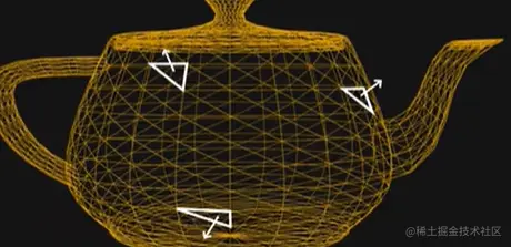 这次还是拿茶壶来做实验,和之前的例子不一样。这次要考虑的是多边形面对的方向,他们不平行与屏幕,而是面对不同方向。面对的方向叫做“表面法线“