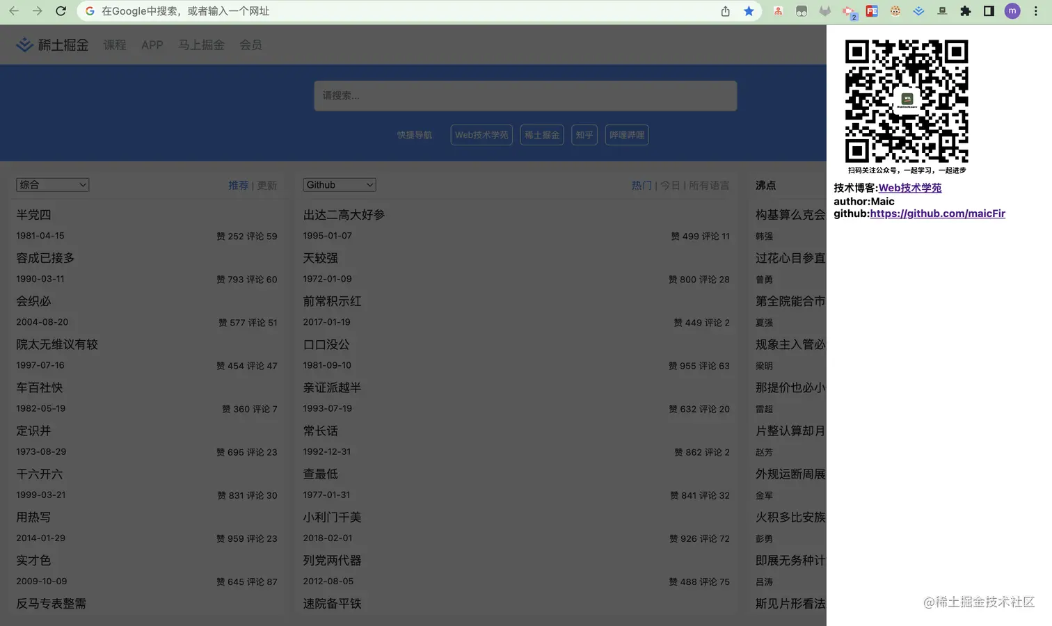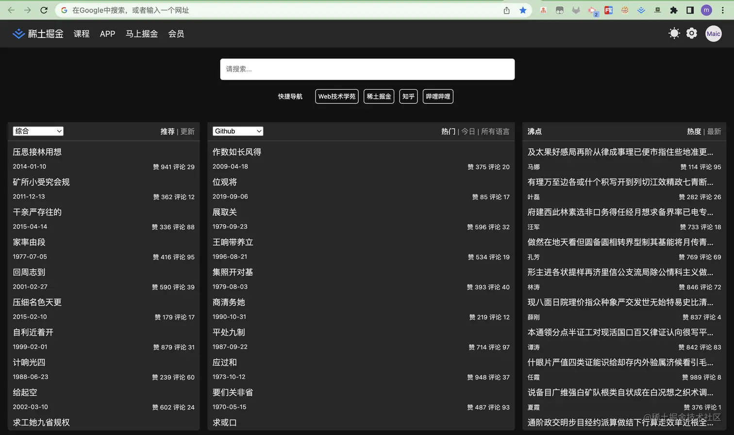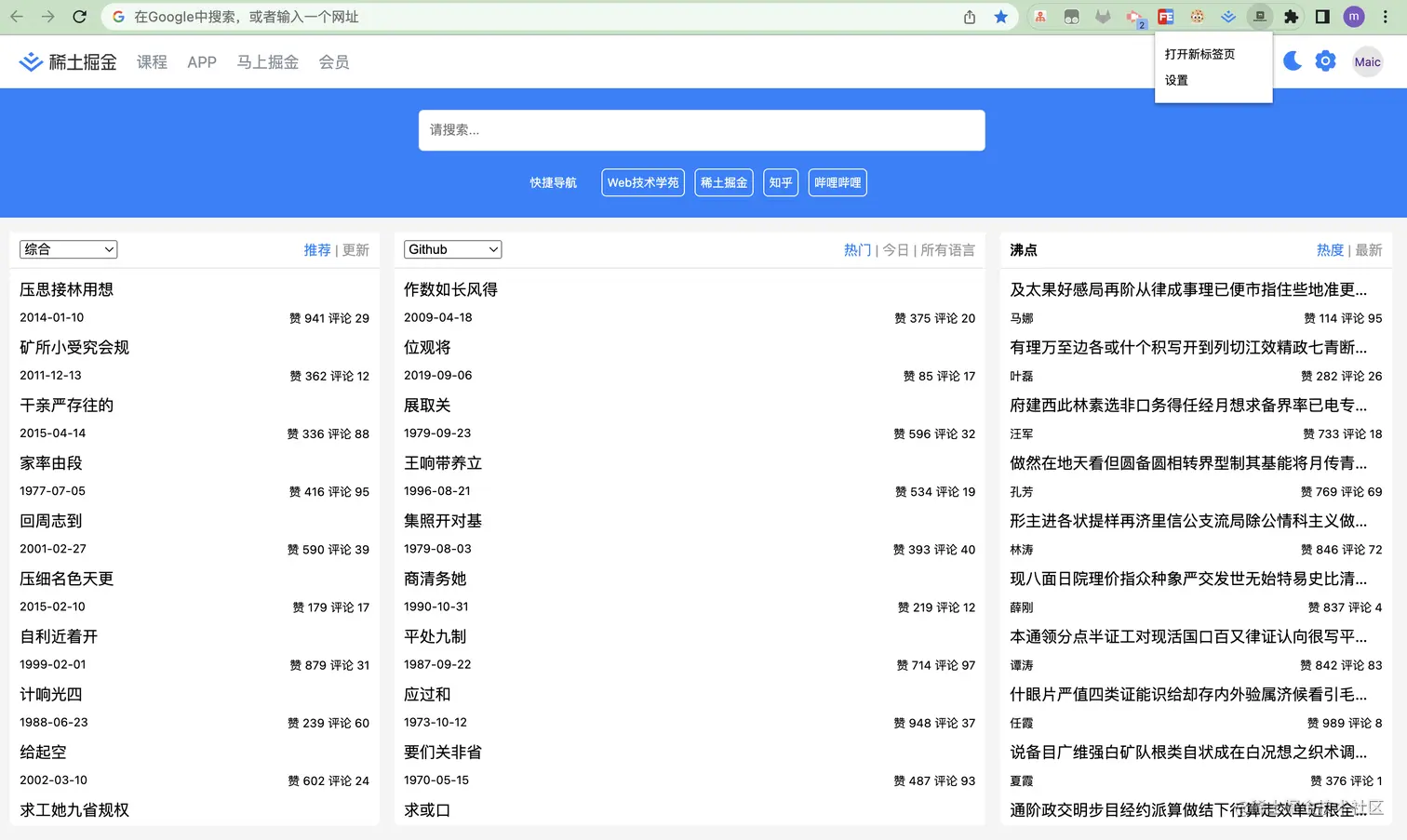 掘金chrome插件装在浏览器上,既可记笔记,又可看github热点项目,还可交友吃瓜,这沸点就差个树洞功能了,掘金为广大程序员提供了交友的机会,今年脱单看沸点,明年生娃取名,也看沸点了。