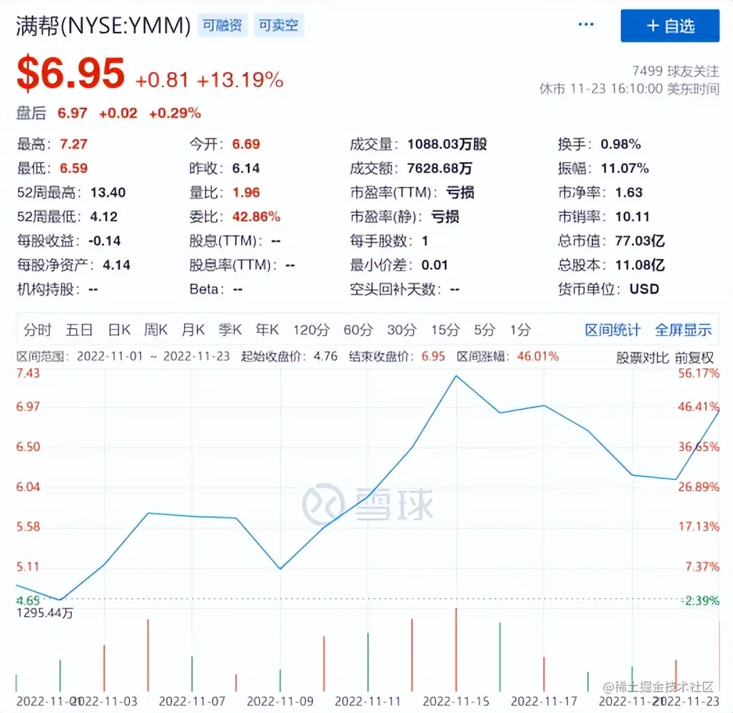11月23日美股盘前,满帮发布了2022年第三季度财报,延续了今年以来极具韧性的发展势头,营收超预期且利润同比扭亏。受此影响,满帮股价于23日晚美股盘中一度大涨逼近20%,截至收盘涨幅为13.19%。
