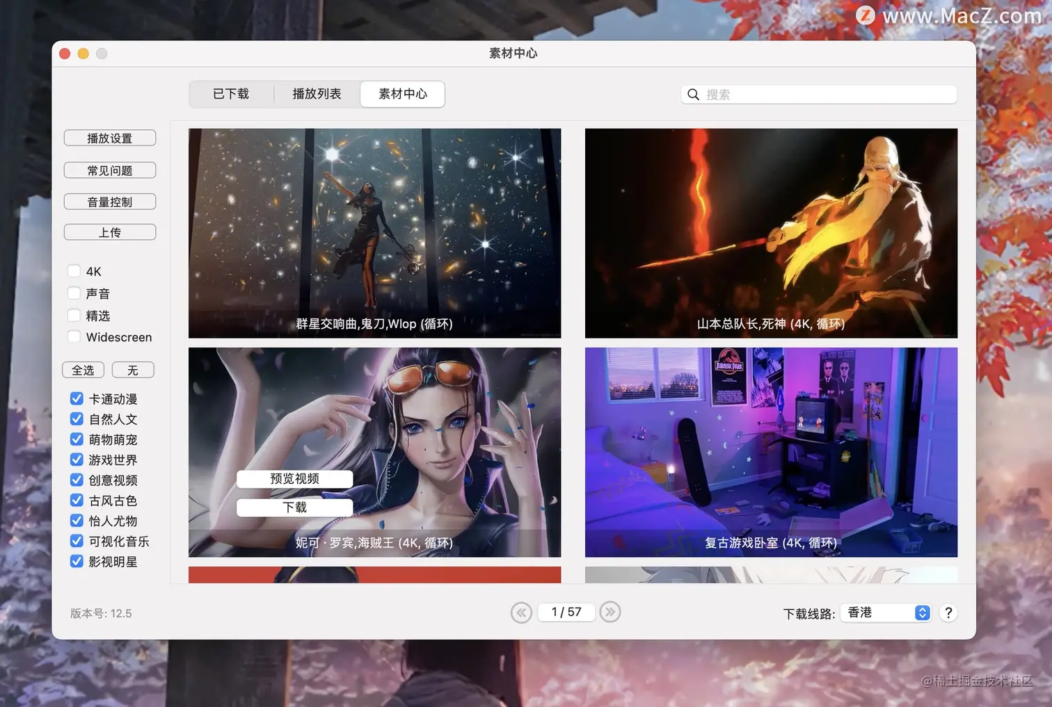 Dynamic Wallpaper mac版是一款非常优秀的视频动态壁纸软件!Dynamic WallpaperMac版视频素材丰富,包含:卡通动漫、自然人文、萌宠萌物、游戏世界、创意视频、古风古色等各种视频动态壁纸风格,总有一款适合你!