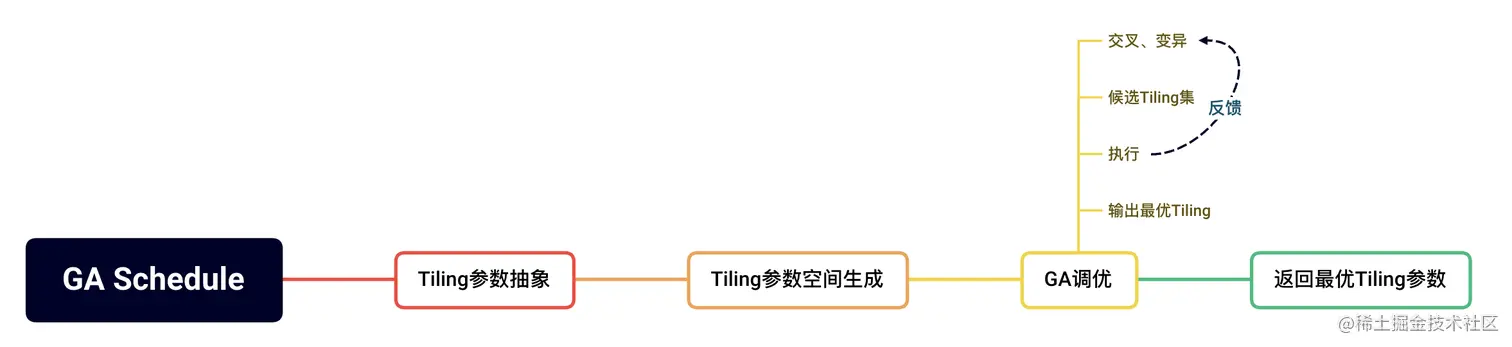 GA Mode 中调优空间分析主要是指 tiling组合分析,生成调优空间后 (tiling参数空间),再利用遗传算法进行调优搜索,最后返回最优的 tiling参数。整个过程如下: