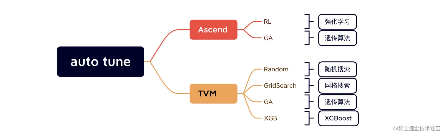 昇腾里的 auto tune 包含两种调优模式:RL 和 GA,而搜索算法在 tvm 里会更加丰富一些,包括:Random、GridSearch、GA、XGBoost。如下: