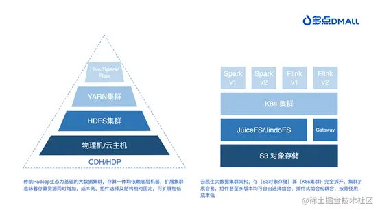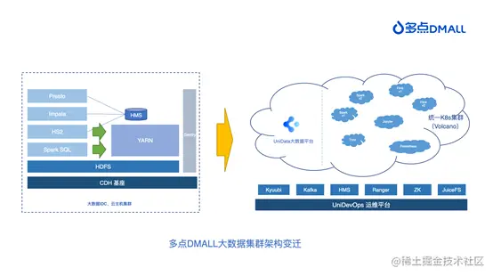 上述技术背景和商业背景的发展,对多点 DMALL 的大数据技术基座持续提出更高的要求。在持续优化升级的过程中,多点 DMALL 的大数据集群架构经历了从传统Hadoop生态迈向云原生,从存算一体到存算分离的架构变迁。
