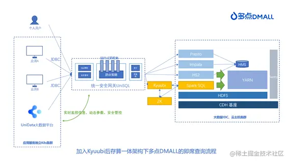 作为 DMALL OS 数字化能力的技术底座,大数据平台历经多次迭代平稳支撑了公司 To B 业务的开展。伴随着国家产业升级的推进和云原生技术成熟,多点 DMALL 大数据技术也经历了从存算一体到存算分离的架构调整变迁。本文将从引入 Kyuubi 实现统一 SQL Proxy 的角度讲述这一探索实践的历程。