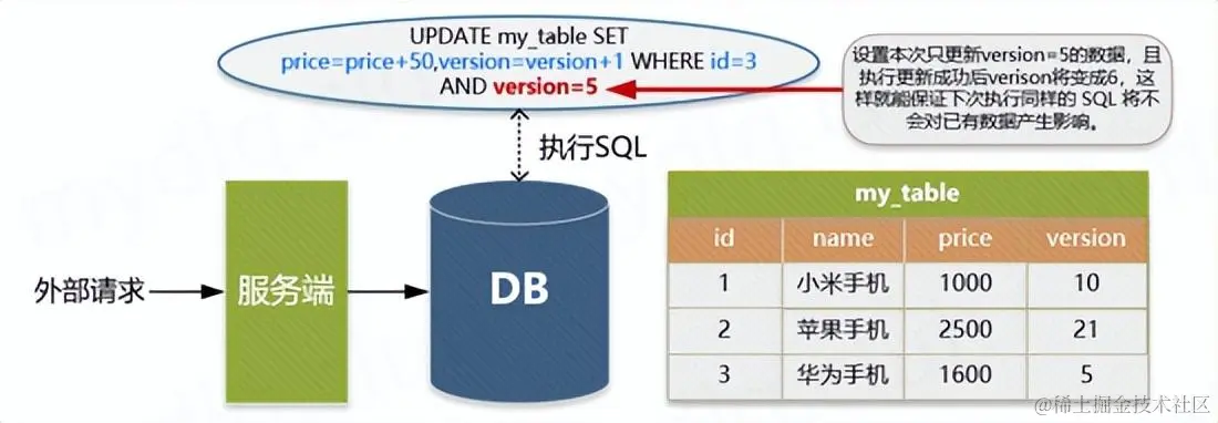 上面 WHERE 后面跟着条件 id=1 AND version=5 被执行后,id=1 的 version 被更新为 6。