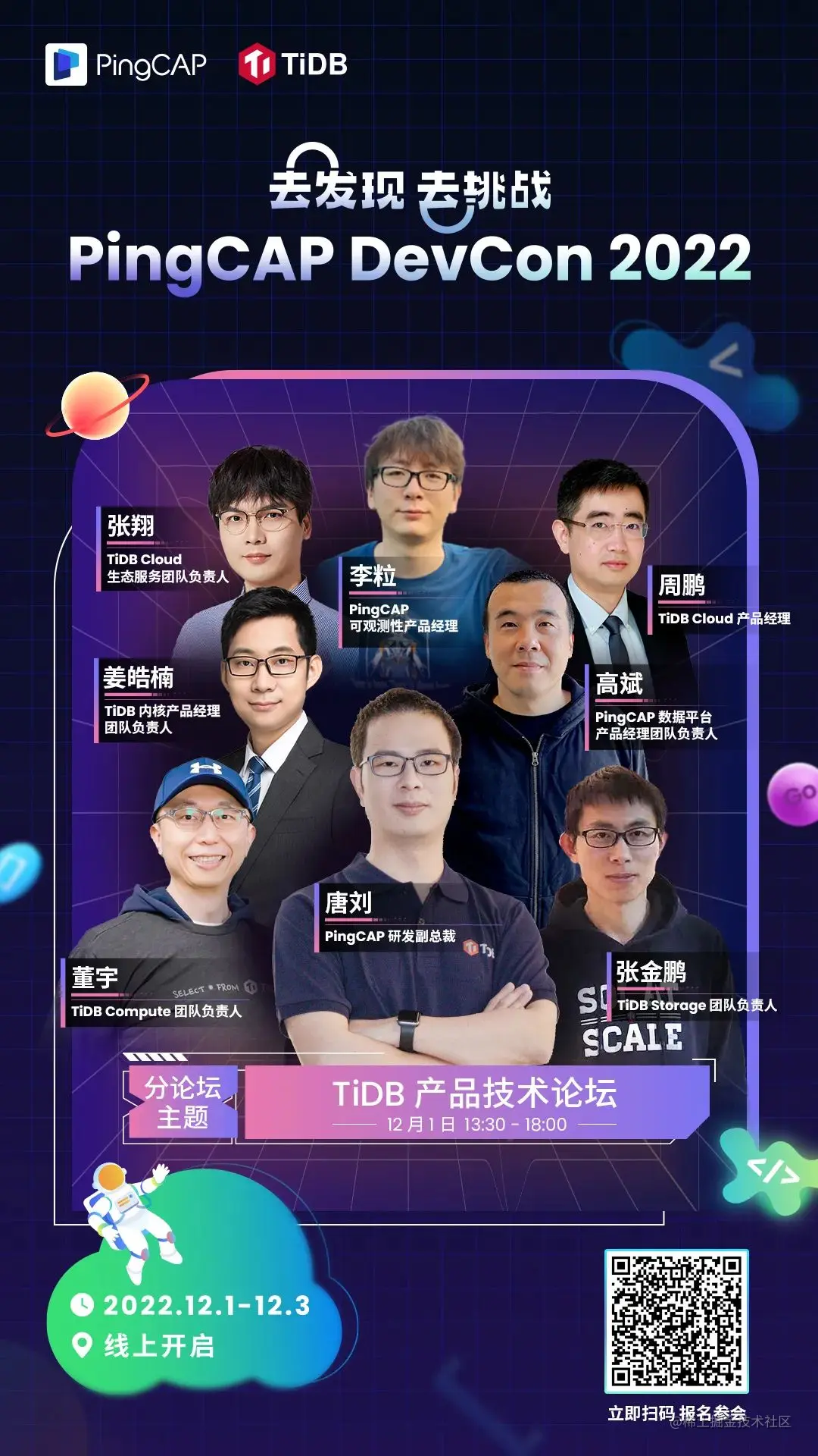 12 月 1 日 PingCAP DevCon 2022 产品技术论坛,聚焦数据技术前沿趋势与应用,PingCAP 产研“最佳阵容”将重点围绕 Serverless、TiDB 新特性、性能调优、稳定性设计、技术生态、应用场景等领域展开分享和探讨, 帮助您快速了解 TiDB 的硬核技术与最新发展方向,助您提升业务场景的服务与创新能力。