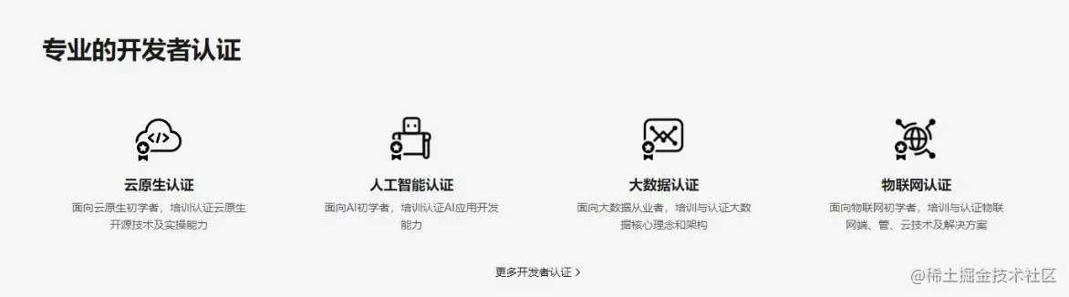 华为云将华为内部的可信认证能力向开发者外溢,在云原生、人工智能、大数据、物联网等技术领域打造可信的开发者认证体系。