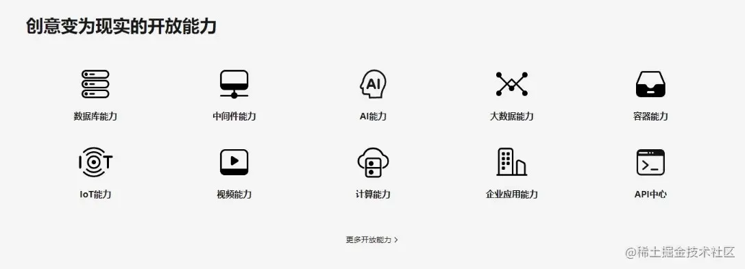 首页第二楼层,开发者可以找到AI、大数据、容器、IoT、中间件、数据库等不同技术域的开放能力,更好地将自己的创意变为现实。